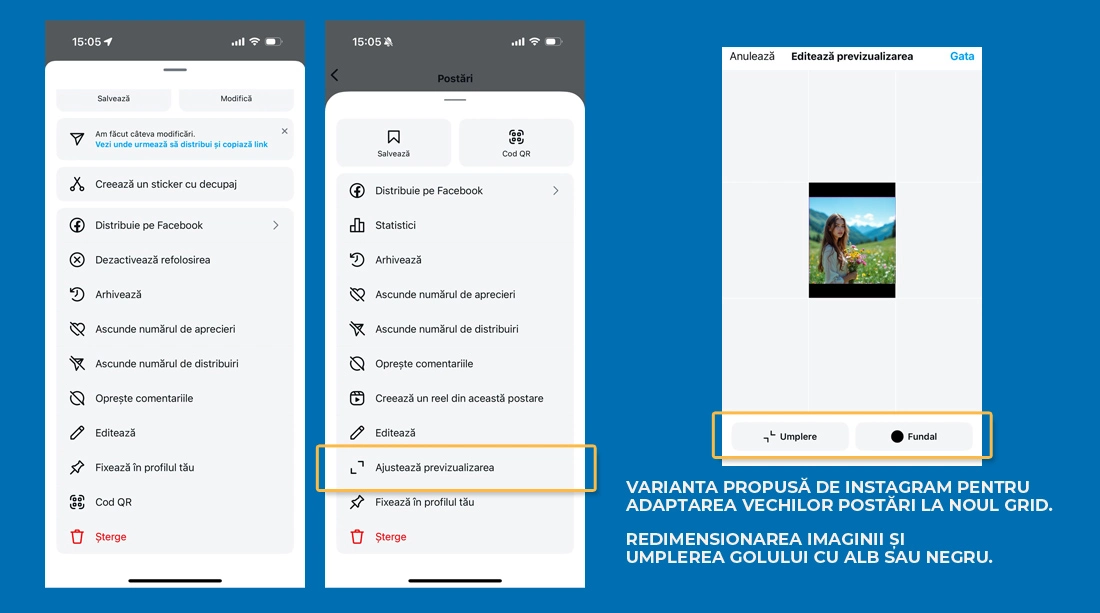 - Revizuirea Conținutului Anterior: Examinați postările existente pentru a identifica eventualele neconcordanțe în noul format și ajustați-le dacă este necesar. Instagram vă pune la dispoziție o unealtă noua pentru ajustări. O găsiți exemplificată în imaginea de mai jos.