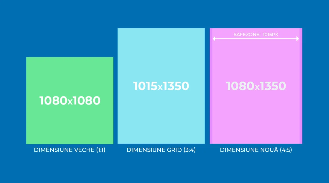 - Cum facem postările: 1080 x 1350 pixeli sau 4:5 (cu atenție la SafeZone-ul de 1015px)